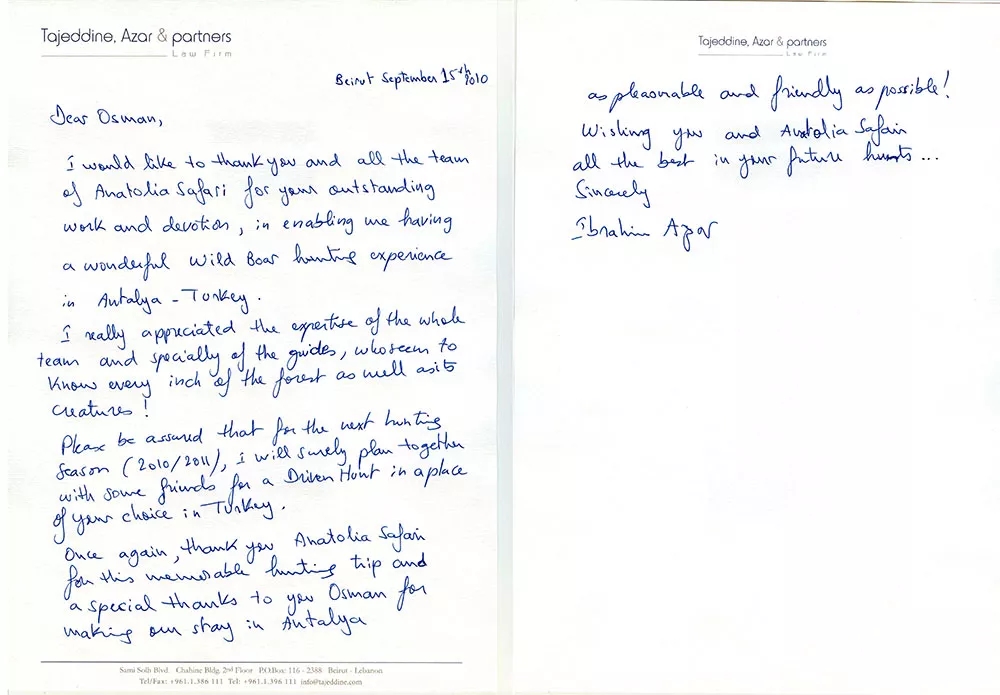 Après l'arrivée en Turquie, le voyage de chasse commence à l'aéroport où un représentant d'Anatolia Safari attend pour aider avec les procédures douanières. Cela est suivi d'un transfert bien organisé vers le terrain de chasse pré-réservé sous la direction professionnelle.